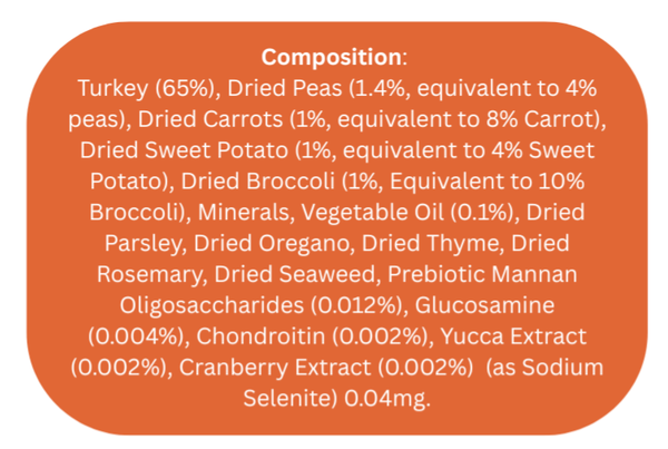 60% turkey, sweet potato and vegetables blended into a rich, savoury gravy to make a nutritious and complete recipe. Serve at room temperature. Made in the UK